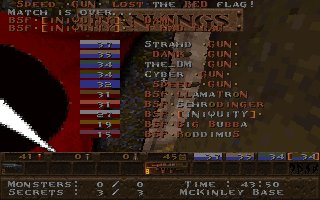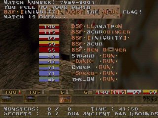 First off, I'd like to say that I'm getting tired of playing with clans that absolutely will not play unless they have sub 100 pings. I have no objections to playing an LPB match with 200+ pings, as long as the pings between both clans are fair. I feel that BSF is obviously a talented clan, but when their best guy's ping is floating close to LAN speed and our guys pings were constantly going in the modem range (200+), it becomes very hard to keep up. Anyway, we were able to win the first match based off excellent teamplay, but lost then second due to a combination of not having a strategy and playing with a disadvantage. Even though BSF won by a total frag count, I can't say that they are the better team. So, as of now, I'm considering this match as a tie. I would like to play these guys again soon to decide who the winner is, although next time we meet, we'll have to have equal playing conditions for both teams.