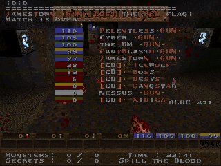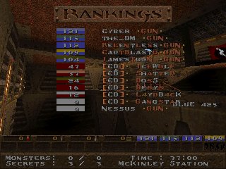 MQF CTF4 Tournament - Round 1 - HPB Squad - For the first *real* clan tournament, I must say that we did a good job. Playing on the new CTF4 levels was much more fun than I thought they might be, and having a chance to play in a meaningful clan match made it much more enjoyable. It was rough getting started and getting everyone's pings evened up, but once we did, we controlled both matches pretty easily. CD showed that they had talent, and managed to hold our flag for a long time during the second match before finally losing it. Our defense and offensive played equally well. Each doing their job almost flawlessly. Good job guys! I'm really looking forward to the second round.