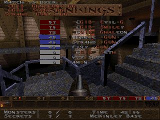 :/ Well.. I really thought we had this game. Keith was back in ass-kicking form, and we weren't doing too bad. Unfortunately our teamplay wasn't clicking as good as it should've been, and CGIB was able to exploit this. CGIB played very well as a team. I didn't think a few of their players would contribute that much at all really, so I was pretty suprised to see how well they did. Especially seeing as how they did better than the 'name' players from CGIB's lineup :). Anyways, good games to CGIB.