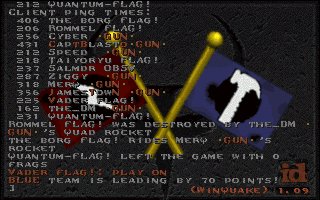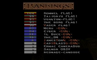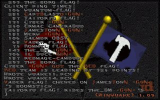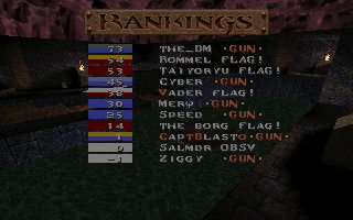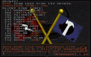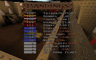 Well, you know it was bound to happen sometime. Flag is considered by many to be the best, so it's only fitting that we lose to someone as good as them. They played extremely well and deserve their win, but considering our ping disadvantage for the first two matches (it was an average of about 100ms difference in their favor), it was more of their ping that killed us than them. It could've been avoided, but I decided for us to go ahead and play knowing our disadvantage at the time. However, the last match we came back to our server (the one we originally suggested) and everyone had similar pings, even though it was a bit more laggy than the first server we played on. With even pings in the last match, we ended up winning 174 to 159. However, Capt got cut off during the match and only had 1 frag to show for in the final pic. One of their guys got pissed and left before the last match was over also (guess he couldn't handle fair conditions :). Anyway, I think we did good considering the spot we were in. I'm planning on getting a rematch with these guys as soon as possible. The next time we play there will be EVEN pings the whole duration of ALL matches. Plus, we'll have Strahd and Dank in the lineup full-time and FLAG! will know very well the feeling of looking down the barrel of our GUNS. ;) hehehe