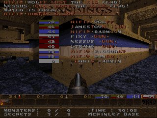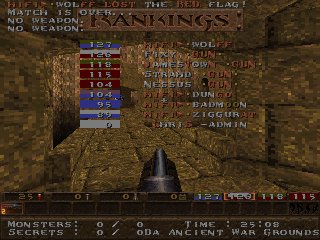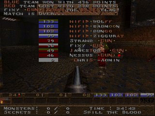 Fixy: The finals were HIFI vs. GUN, and we lost 2-1. But, there's something to be explained therein.. With 8 minutes and 44 seconds to go in the first game, GUN was playing HIFI's map pick: CTF1. The map they're supposedly able to OWN beyond anyone else coming back or even getting a frag. At the afore mentioned time index it was GUN up by 60 points, all the runes in our posession, and that special "flow" of the game happening between us (quad timed, pimpage on the LG platform, sniper in the bunker.. str on D..) And then disaster struck. Well, for us. For HIFI, it was a miracle. Some LLAMA organizer who was leaving early was disconnecting his computer and he fucking managed to disconnected HIFI's hub from the big aftershock LAN. GODDAMNIT! We paused within 10 seconds, but HIFI refused to join back in, GHOST code to their previous positions, and continue. In the end it was decided that we would continue, but GUN lost a cap (45 frags) since they claimed we capped in the 10 seconds they were disconnected and not paused. Lame. And on top of it, HIFI unpauses the game so I lose my resist in the water drowning while I'm over talking to them trying to figure out what to do. When we started back up, HIFI got resist, stormed the base with quad, and capped for the win by 25-30 frags. Lame. No fucking comment. Then it was CTF5. We pimped this level with maximum ownage. Well, until the last 4 minutes when HIFI, down 400 points, capped like 7 times in 3 minutes. With 10 seconds to go it was Dungo about 5 steps from the flag, about to cap for 45 points, with us only up 43 points (ie: if they cap, they win by 2 points) when Strahd rips apart their 2x, their resist and hooks dungo in the back, killing him with his flag in sight. GUN wins. Then it was Spill the Blood. Everyone, including HIFI, seemed to dread playing this level. Sigh. No matter what happens, one team is going to get the beat down. BEcause one team will lock down quad + runes, and that's it. HIFI spawned with STR and RESIST in their base. They locked down Quad. We lost. Nothing much else too it. There were no hard feelings between HIFI and GUN, infact we all went to a donut shop (country style Strahd!) and talked for about an hour.. T'was great fun. On another note.. I just checked the Aftershock web BBS.. Here's what a llama-loser DM'er that was sitting in the row between ourselves and CGIB/BB had to say about us CTF'ers: "The people were all cool, except those faggot Q1 CTFers that sat in front and behind me screaming out obscenities every two seconds. I think they should have been thrown out. Total losers." Haha. When a games get heated, you can distinctly hear "FUCK! He;s got QUAD!" and "GOD DAMNIT! DOn't steal my red armour!" hehehe. Oh well. |