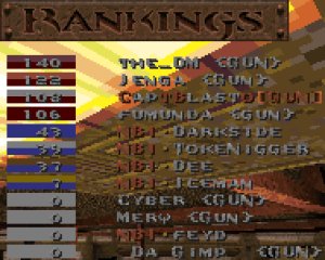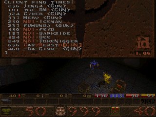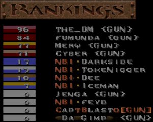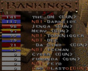 For our first CTF match, I don't believe we did too bad. The first level was definitely the best. NBI came out ready to play, and gave us a very hard time. They managed to take the lead twice as both sides vied for control, but once we got settled, we were able to hold the lead for the rest of game. For the next two levels, our clan was unstoppable. Some of the best team efforts I've seen yet in a clan match. Excellent job guys! Thanks to NBI for a good challenge as well. These guys are awesome players, so don't underestimate them. If any other clan thinks that they can take the NBI clan after looking at our scores against them, think again, 'cause you might just get your butts kicked... really, really bad. :)